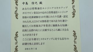 情報通信エンジニア10年以上連続更新表彰状を頂戴しました