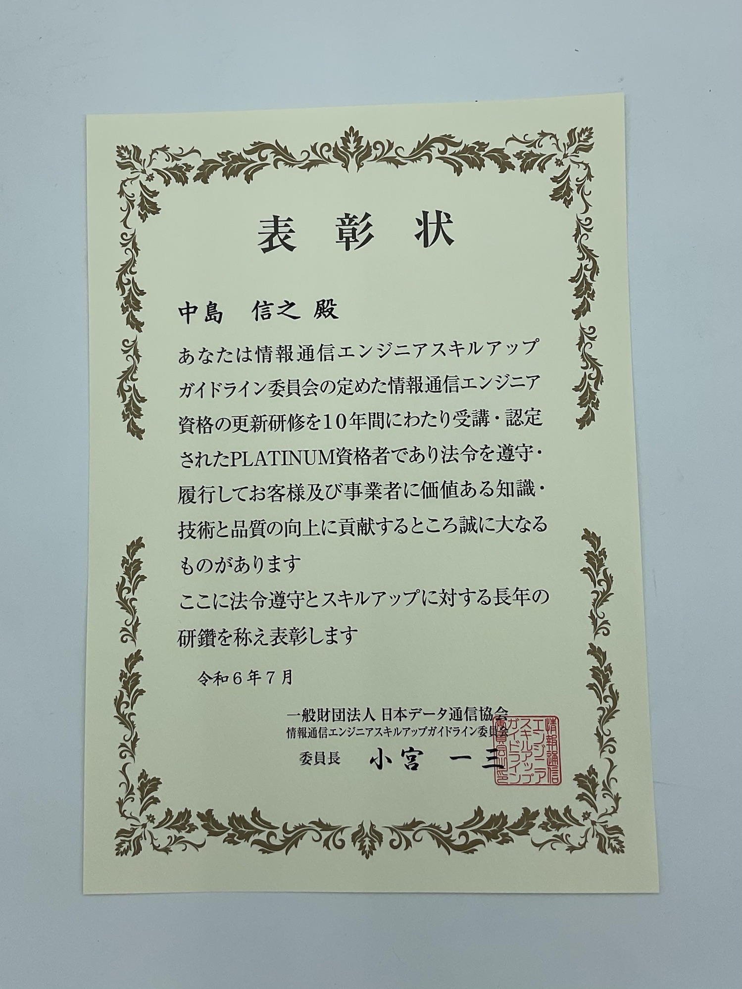 2024/07に一般財団法人日本データ通信協会(情報通信エンジニア事務局)より表彰状を頂戴しました。